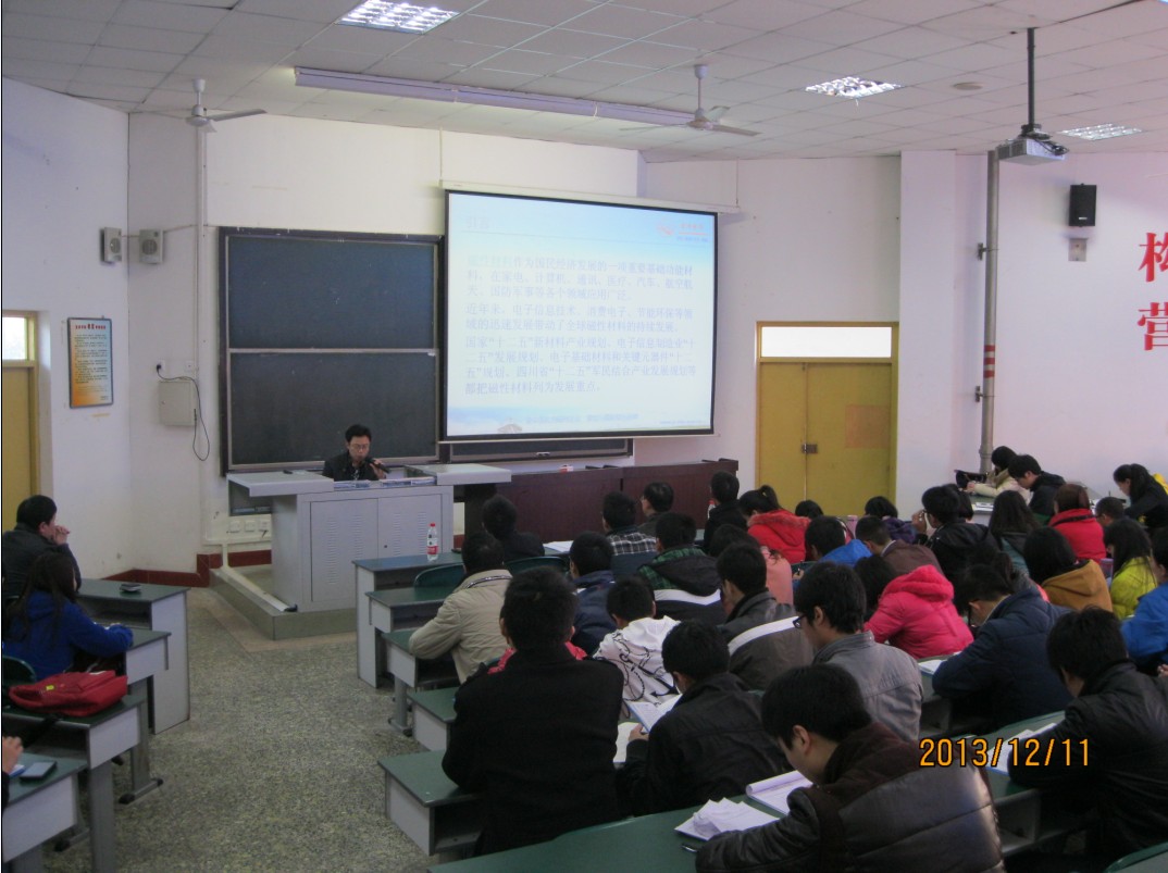 2013年12月11日宜宾金川电子有限责任公司科技质量部副部长王明银工程师应邀为我校师生作“我国磁性材料产业的现状与发展趋势”报告。