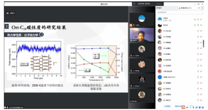 负热膨胀材料是材料科学中近年来新兴的学科分支。吕珍龙首先介绍了课题组的最新研究成果,通过理论研究,课题组发现了一个具有奇特性质的新的碳同素异形体Ort-C24,并对其电子结构、拉伸、热膨胀等性质进行了理论模拟,研究表明它具有动力学、弹性和热力学稳定性,并且可能存在于烟灰或爆炸产物中;同时该类物质还呈现出负压缩系数、负热膨胀系数和超强耐拉性等特性,此研究为今后的实验以及应用提供理论指导。