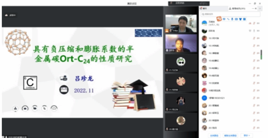 2022年11月8日,河南科技大学吕珍龙博士通过腾讯会议为我校师生做了一场《具有负压缩和膨胀系数的半金属Ort-C24的性质研究》的学术报告。报告由万明杰博士主持,我校理工类200余名师生参加了本次会议。