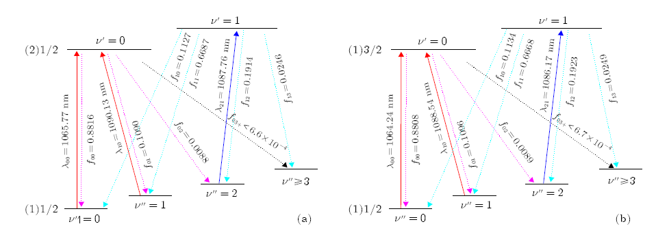 本工作计算中考虑了自旋-轨道耦合效应,计算表明(2)1/2↔(1)1/2 和(1)3/2↔(1)1/2跃迁为直接跃迁, 具有高对角分布的FCF;同时(2)1/2 和(1)3/2 激发态有很短的自发辐射寿命,本文给出了(2)1/2↔(1)1/2 和(1)3/2↔(1)1/2准闭合能级循环跃迁进行激光冷却KCl–阴离子的方案。分别选取3束激光驱动(2)1/2↔(1)1/2 和(2)1/2↔(1)1/2 跃迁,主激光波长分别为1065.77和1064.24 nm。最后预测了两种方案进行激光冷却KCl–阴离子的多普勒温度和反冲温度。