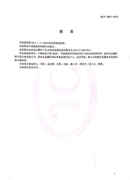 该标准起草单位为:中国地质大学(武汉)、中国地质科学院郑州矿产综合利用研究所、咸阳非金属矿研究设计院有限公司、国家非金属矿制品质量监督检验中心、宜宾学院、佛山市顺德区质量技术监督标准与编码所。该标准主要起草人为:李珍、金成国、朱萌、沈毅、郝小非、胡宏杰、侯立兵、陈媛。